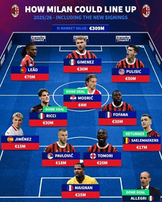 AC米兰已经官宣莫德里奇加盟,德转列出米兰新赛季潜在首发阵容,魔笛、里奇在列,萨勒马科尔斯右后卫的。